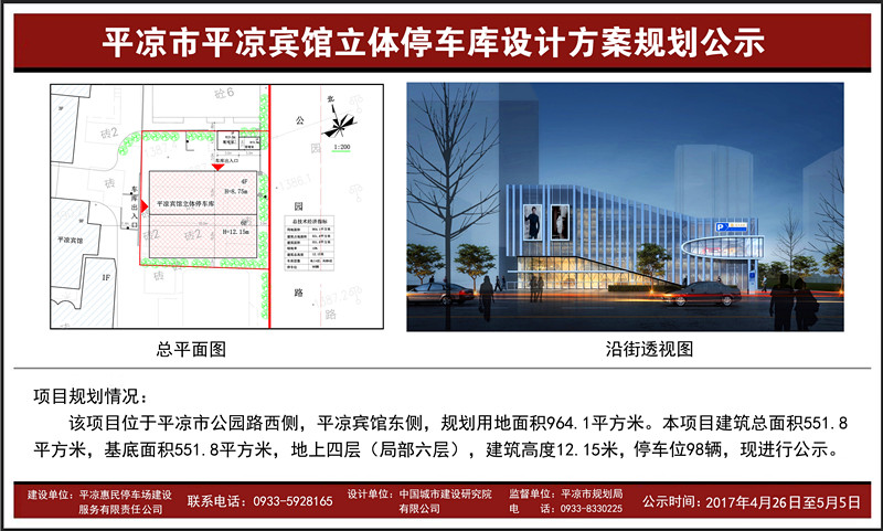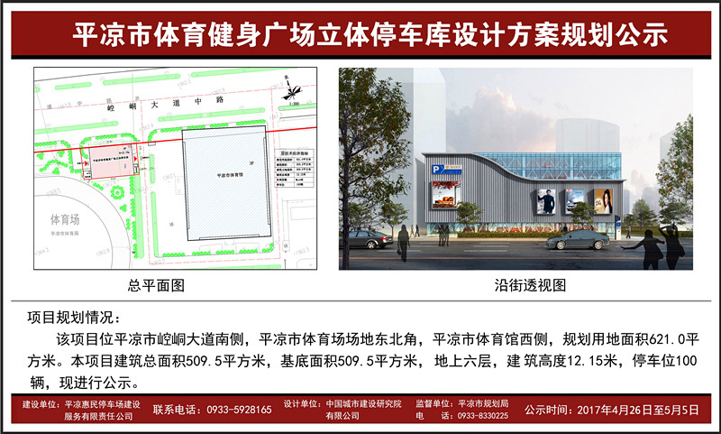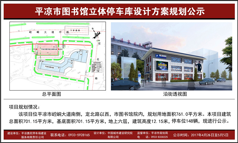 平?jīng)鲑e館、體育健身廣場、市圖書館3處立體停車庫設(shè)計方案經(jīng)市規(guī)劃局審查及市規(guī)委會2017年4月第一次會議審定通過。4月26日下午, 3處立體停車庫設(shè)計方案在規(guī)劃局網(wǎng)站上公示。