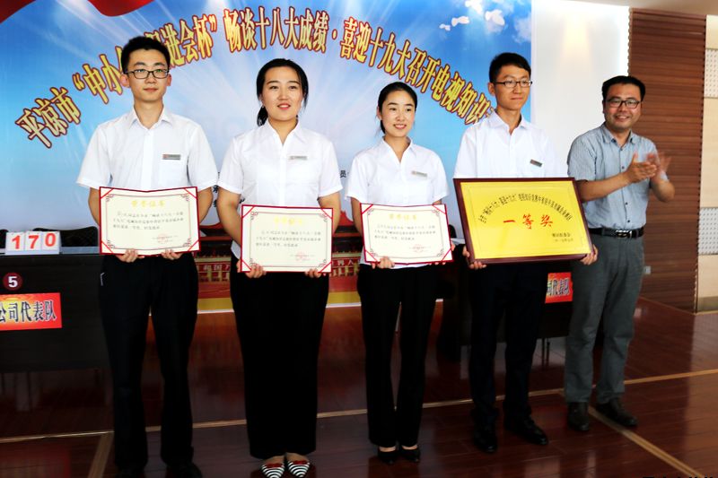 競(jìng)賽結(jié)束后,伴隨著歡快的音樂聲,市委宣傳部副部長(zhǎng)雷勇走上臺(tái),為全市暢談十八大·喜迎十九大電視知識(shí)競(jìng)賽中省駐平及市屬企業(yè)賽區(qū)第一名——平?jīng)鍪谢菝窆敬黻?duì)頒發(fā)一等獎(jiǎng)獎(jiǎng)牌和證書。
