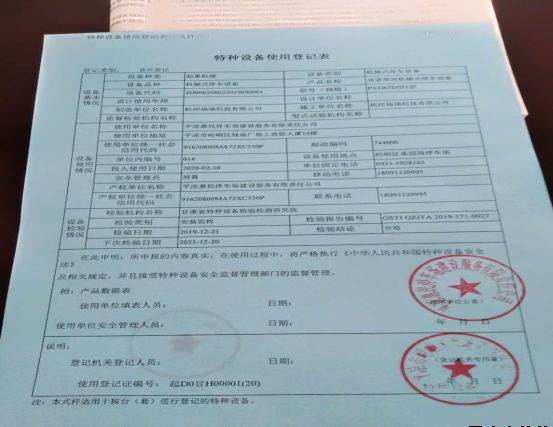 為保證果園路立體停車庫安全運(yùn)營(yíng),2019年12月15日設(shè)備安裝廠家委托甘肅省特種設(shè)備檢驗(yàn)檢測(cè)研究院對(duì)果園路立體停車庫設(shè)備進(jìn)行了現(xiàn)場(chǎng)檢驗(yàn),于2019年12月21日出具了檢驗(yàn)報(bào)告。按照特種設(shè)備管理辦法的要求,停車場(chǎng)公司積極銜接崆峒區(qū)質(zhì)量監(jiān)督局,提交了辦理特種設(shè)備使用登記證所需的各種資料及證明文件,2020年3月5日順利取得果園路立體停車庫特種設(shè)備使用登記證。