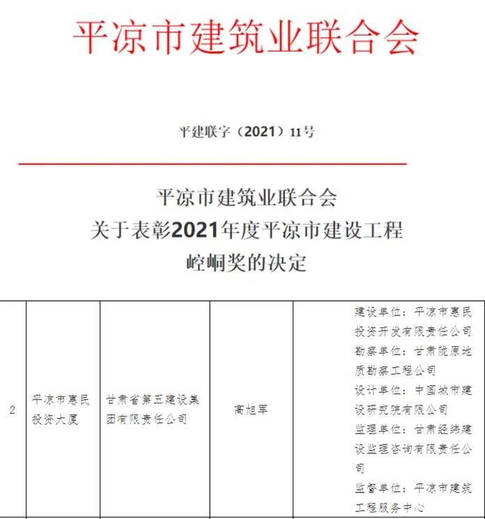 歲末年初,捷報頻傳,在公司上下歡慶惠民公司成立十周年之際,平?jīng)鍪薪ㄖ髽I(yè)聯(lián)合會發(fā)布《關(guān)于表彰2021年度平?jīng)鍪薪ㄔO(shè)工程崆峒獎的決定》,由平?jīng)鍪谢菝裢顿Y開發(fā)有限責任公司開發(fā)建設(shè),房產(chǎn)公司具體實施的惠民投資大廈項目榮獲2021年度平?jīng)鍪薪ㄔO(shè)工程崆峒獎。