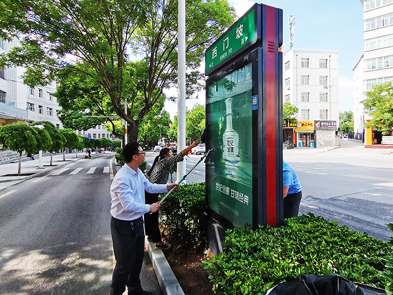 活動中,全體員工分組前往西門坡、文化街、石家巷、西大街等城區(qū)主干道,對道路指示牌進行了認真細致的清洗,鏟除清潔了粘貼的小廣告,對廣告設施內(nèi)部電子元件做了維護保養(yǎng),確保箱體無積塵、無亂涂畫、無亂張貼等現(xiàn)象,以實際行動為創(chuàng)建文明城市和公司發(fā)展貢獻力量。