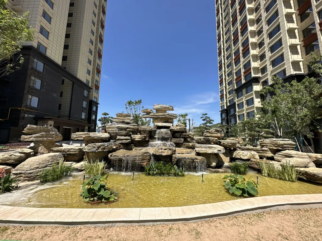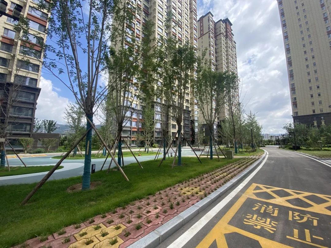 小區(qū)主入口路面采用花崗巖石材配祥云文化地雕,高低錯落有致,如一幅畫卷徐徐展開。新中式大門高端大氣,氣勢恢宏。項目北側為涇河干流綜合治理項目兩路綠化工程,漫步于綿延不絕的綠色長廊,盡情呼吸空氣中的負氧離子,臨河水邊嬉戲,于公園中游玩。由北側入苑后印入眼簾的是一幅淡墨山水畫境,兩側以錯落起伏的波浪草丘為山,營造出鐘靈毓秀的山川大河之景。設計巧妙的利用了消防登高場地透水混凝土作為活動健身廣場和超級植草地坪相結合,既滿足消防要求的同時又提升了小區(qū)品質。小區(qū)綠化率高達37.15%,喬、灌木搭配種植,高低錯落、疏密有致、四季常綠、季季有花。開窗可見綠,出門可踏青,環(huán)境宜人。