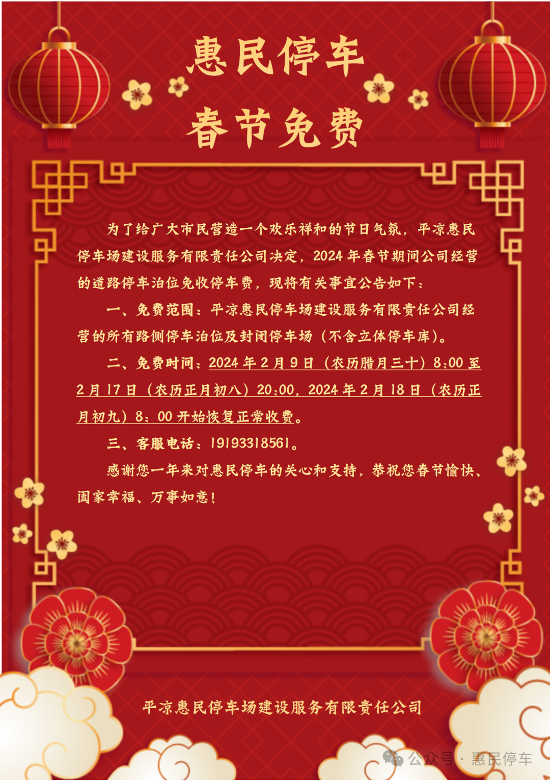 春節(jié)長假期間(除夕至正月初八),惠民停車場公司免費開放了城區(qū)經(jīng)營范圍內(nèi)的24處封閉式停車場和全部路側(cè)停車泊位,為市民和游客提供便利,助力營造歡樂祥和的春節(jié)氛圍。