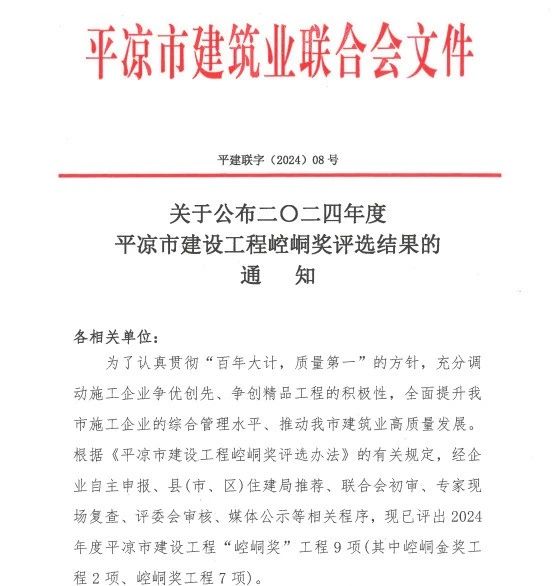 平?jīng)鍪薪ㄖこ?/span>“崆峒獎”作為平?jīng)鍪薪ㄔO(shè)工程質(zhì)量最高榮譽(yù),評選標(biāo)準(zhǔn)高,質(zhì)量要求嚴(yán),經(jīng)過縣(市、區(qū))住建局推薦、聯(lián)合會初審、專家現(xiàn)場復(fù)查、評委會審核、媒體公示等相關(guān)程序逐級評選。