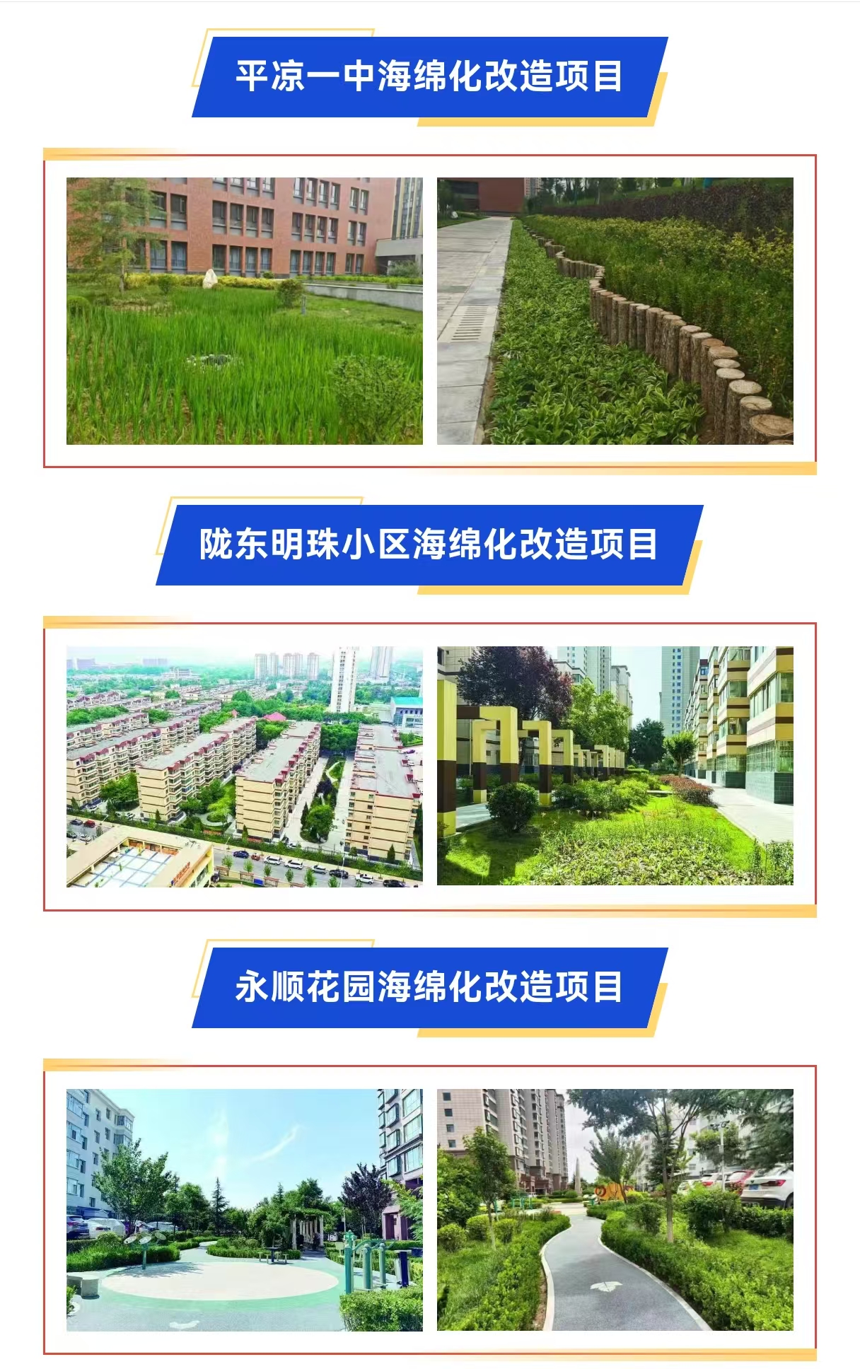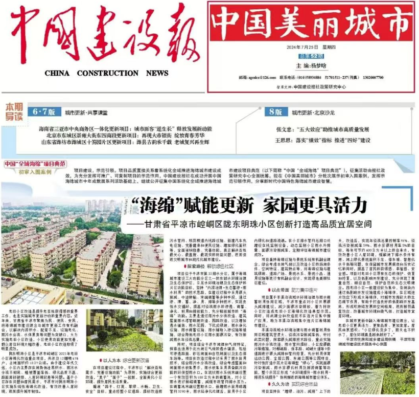 日前,經(jīng)來自中國科學院、住建部科學技術委員會、中國城市規(guī)劃設計研究院、北京大學、清華大學等單位的15位權威專家審核,綜合網(wǎng)絡投票情況產(chǎn)生了2024年度“中國‘全域海綿’項目典范”首批終審入圍案例。城建投公司施工的隴東明珠小區(qū)老舊小區(qū)改造項目、平?jīng)鍪械谝恢袑W海綿化改造工程、永順花園海綿化改造工程等3個項目成功入圍,并先后在《中國建設報·中國美麗城市》刊登介紹。