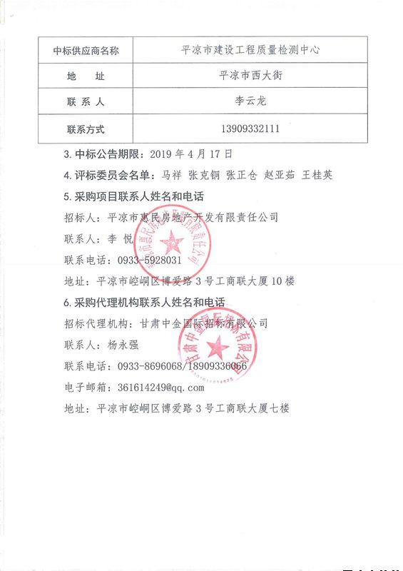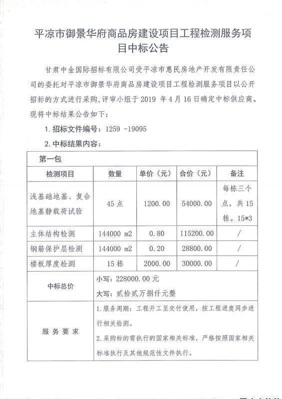 平?jīng)鍪杏叭A府商品房建設項目工程檢測服務項目中標公告