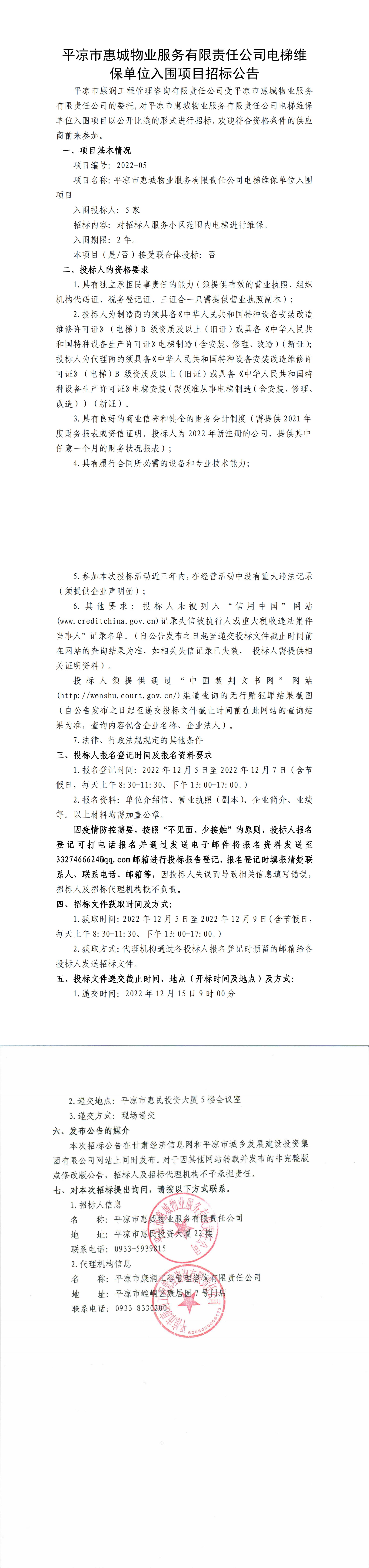 平?jīng)鍪谢莩俏飿I(yè)服務(wù)有限責(zé)任公司電梯維保單位入圍項(xiàng)目招標(biāo)公告