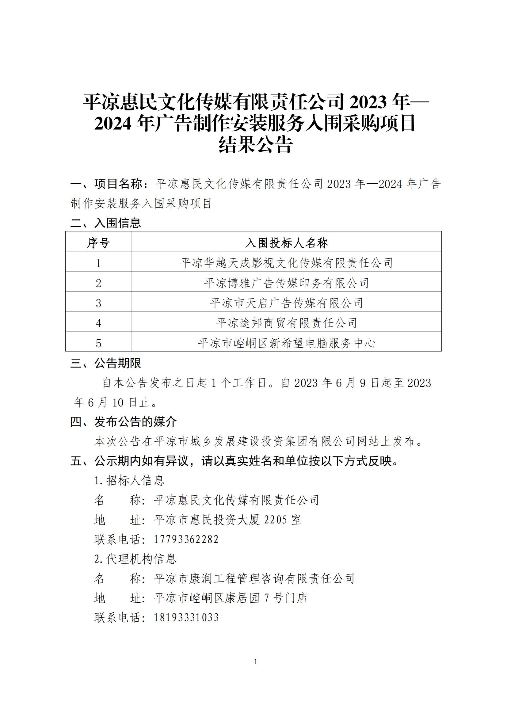 平?jīng)龌菝裎幕瘋髅接邢挢?zé)任公司2023年—2024年廣告制作安裝服務(wù)入圍采購(gòu)項(xiàng)目結(jié)果公告