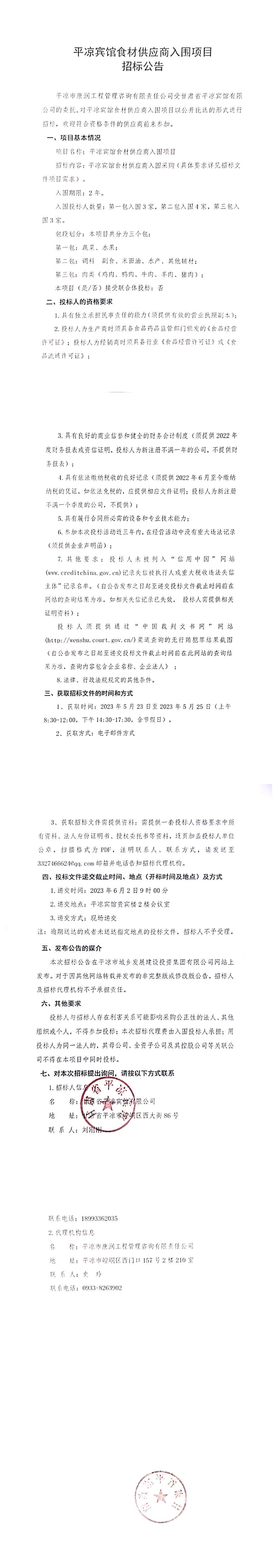平?jīng)鲑e館食材供應(yīng)商入圍項(xiàng)目招標(biāo)公告